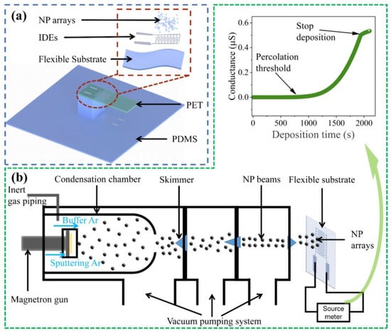 (a) Schematic of a NP array-based flexible multifunctional sensor; (b) schematic diagram of the NP deposition system and the real-time conductance evolution of NP array in deposition.