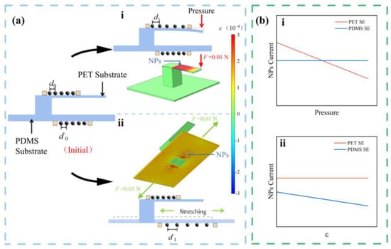 (a) The FEA results of (i) pressure and (ii) strain stimuli; (b) current evolution trends of the NP arrays responding to (i) a pressure loading and (ii) a strain on PET and PDMS.