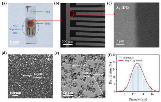 (a) Photograph of PET SE; (b) SEM image of IDEs from (a); (c) SEM image at electrode boundary; (d) SEM image of NPs; (e) TEM image of NPs; (f) particle size statistics of NPs.