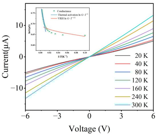 To analyze the electron transport properties, the current–voltage (I–V) curves of NP arrays on a PET substrate were measured at different temperatures. Figure 4 displays a collection of I–V curves obtained at different temperature settings. An increase in temperature enhances the steepness of the I–V curve, indicating a greater conductivity of the NP arrays. The conductance of NP arrays exhibits a positive temperature dependence, which is completely distinct from the conductance-temperature dependence in typical continuous metal films. The zero-bias conductance () of NP arrays would be chosen as the intrinsic conductance at the temperature regime from 20 K to 300 K and presented in a logarithmic form the inset of Figure 4. Notably, two distinct slopes can be observed, corresponding to two different electronic transport models: the variable range hopping (VRH) at a lower temperature regime [35,36], and the thermal activation near room temperature [37,38]. No matter what transport model corresponds to, the electronic transport in NP arrays is quantized, ensuring the high performance of sensors based on NP arrays.