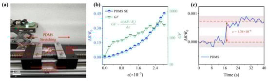 (a) Schematic diagram of strain response test; (b) resistance and GF change in NP arrays on PDMS under strain; (c) real-time response of NP arrays to the smallest detectable stain variation of 1.34 × 10−4.