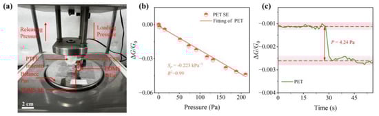 (a) Schematic diagram of strain response test; (b) conductance change in NP arrays on PET under pressure; (c) real-time response of NP arrays to the smallest detectable pressure variation of 4.24 Pa.