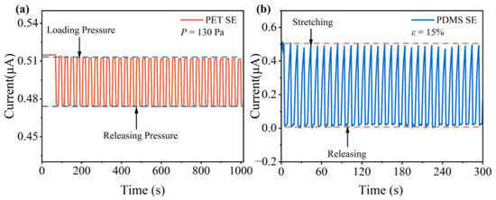 (a) Pressure repeatability response curve of NP arrays on PET substrate at P = 130 Pa; (b) strain repeatability response curve of NP arrays on PDMS substrate at ε =15%.
