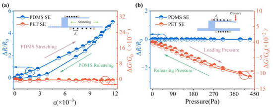 (a) Strain-response curves of NP arrays on PET and PDMS (includes a cycle response of loading and releasing); (b) pressure-response curves of NP arrays on PET and PDMS (includes a cycle response of loading and releasing).