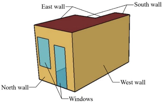 In this study, the simulated building is an office room located in Wuhan. The basic room sizes are 4.81 m length, 2.5 m width, and 2.88 m height. The office is divided into two areas: air-conditioned and non-air-conditioned areas. The air-conditioned area is 9.25 m2. For the studied air conditioner, the nominal cooling and heating capacity are 3500 W and 4500 W, respectively. Its nominal cooling and heating power are 1110 W and 1500 W, respectively. To obtain the wall surface temperature, supply air volume, and supply air temperature, this study first developed an EnergyPlus model for the separate office, as shown in Figure 2. The north wall is the external wall and the corridor is outside the south wall. The rest are the inner walls adjacent to the rooms with the air conditioning off. The heat transfer coefficients of the exterior wall, exterior window, and the roof are 0.55 W/(m2·K), 2.1 W/(m2·K), and 0.37 W/(m2·K), respectively. The EnergyPlus model uses parameters of the actual experimental air conditioner in the office and the typical meteorological year data of Wuhan are used for modelling. The air conditioner is a constant air volume type working from 09:00 to 17:00 each day. Only one person is simulated in the room with indoor temperature set as 26 °C at heating operations.