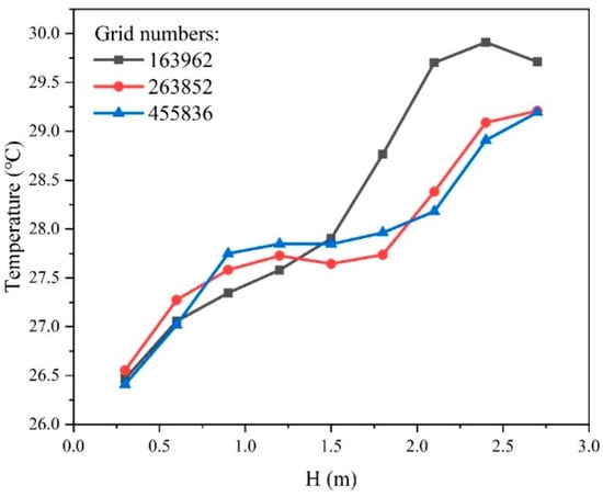 The grid independence test is conducted to reduce the impact of grids on simulation results. Figure 4 shows the grid independence test results after comparing the temperatures of nine points on the line segment (x, y, z) = (1.25, 2, 0.3–2.7) m under three grid sizes: 160 thousand, 260 thousand, and 450 thousand grid divisions. For the three grid sizes, the temperature variation trends are quite consistent. In particular, the temperature difference between the 260 thousand grid and 450 thousand grid is less than 1%. Therefore, this study chose the grid partitioning method of 260 thousand grid for the Fluent simulation, as shown in Figure 5. The grid size of the supply and return air outlets is 0.05 m while the grid size of other places is 0.07 m.