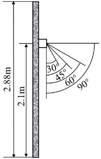 Boundary conditions are another important part of Fluent simulation. Different boundary condition settings can lead to completely different simulation results. In this study, the boundary conditions of Fluent are provided by EnergyPlus. The heating temperature is set as 26 °C in EnergyPlus. Based on the air outlet area in the Fluent model, the three different air supply velocities 3 m/s, 4 m/s, and 5 m/s are air flow volumes of 0.1098 m3/s, 0.1464 m3/s, and 0.183 m3/s, respectively. The air supply temperature and indoor heat source boundary conditions are predicted for the three velocities. The boundary conditions of the co-simulation and the Fluent simulation are summarized in Table 1. The boundary conditions of the Fluent simulation are calculated based on the indoor–outdoor temperature difference and the heat transfer coefficient of the building envelope. Since rooms next to the target experimental room are non-air-conditioned, the heat flow boundary of the inner wall still uses the indoor and outdoor temperature difference. The velocity inlet boundary is used for the air supply outlet. The exit boundary conditions are free outflow. In addition to air supply velocities and temperatures, four different air supply angles of 30°, 45°, 60°, and 90° are set out in Figure 6.