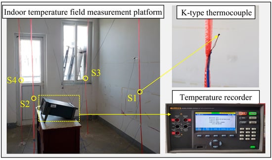 To validate the model simulation accuracy, indoor temperatures were measured and collected from the office room. The K-type thermocouples were used. The temperature recorder measured the range from −270 °C to 1372 °C with a temperature measurement accuracy of 0.6 °C. Figure 7 shows the four sensors were arranged at a head height of approximately 1.1 m in the office when the person was sitting still. The measurements were performed in winter. The temperature acquisition interval was 1 min. The air conditioner operated from 09:00 to 17:00 and the temperature was fixed at 26 °C. The experimental air-conditioner air-velocity block was used to measure the experimental air velocity (about 3 m/s in this study). The air supply angle was first set as about 50° horizontally facing downward. The personnel occupancy area is divided equally into four zones. For each zone, a sensor measurement point is arranged in the center. Locations of the temperature sensors are depicted in Figure 8.