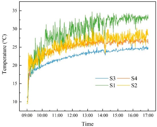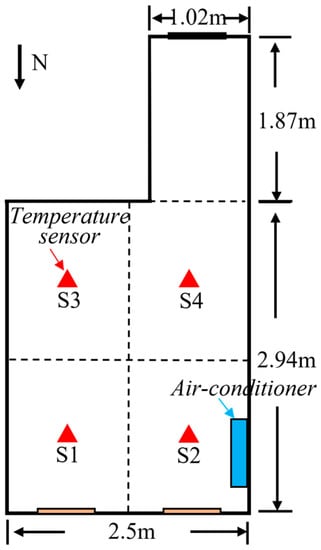 Figure 9 shows the indoor temperature variations in the four temperature sensors. S1 and S2 show larger temperature fluctuations than the other two points. This is because the two points are placed on the side of the air-conditioner outlet. Air outflow from the air conditioner would lead to great temperature fluctuations in airflow near the measurement point. After the air conditioner began to work at 09:00, the air temperature rose rapidly. At around 13:00, the indoor temperatures of the four sub-zones tended to be steady which shows a much lower temperature increase than the previous 4 h.