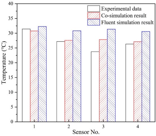 In order to verify the co-simulation results, the data exchange was chosen at 13:00 when the data started to stabilize. An example of 3 m/s supply air-speed case was used for model validation. The temperatures of the four positions were derived from the co-simulation and the Fluent simulation. The simulated data were compared with the experimental data as shown in Figure 10. Considering the temperature fluctuations in experiments, the average temperature values from 13:00 to 13:59 were compared with the simulation results. The results indicate that co-simulation results are closer to the experimental data than the simulation results for Fluent alone.