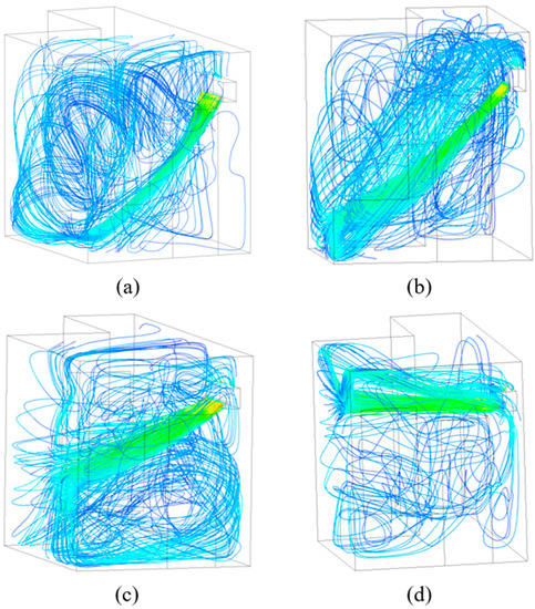 Taking the 3 m/s supply air velocity as an example, the streamlines of the four wind directions are shown in Figure 11a–d. To better compare the effects of different airflow organization on indoor thermal comfort and air-conditioning energy consumption, cross-sections with X = 1.25 m and Z = 1.1 m were selected for further comparisons. The positions of the cross-sections in the model are shown in Figure 3.