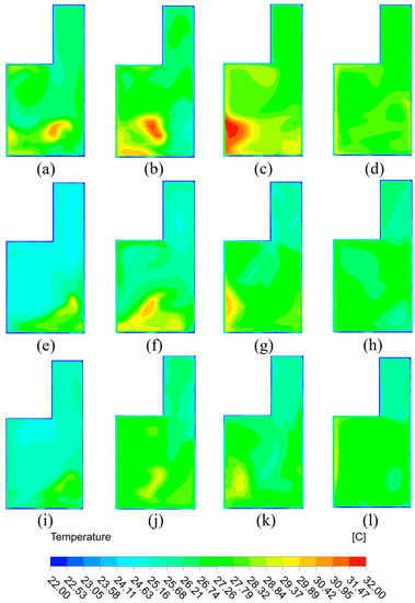 Figure 12a–l show the temperature distribution of the Z = 1.1 m cross section with four different air supply angles when air velocities are 3 m/s, 4 m/s, and 5 m/s. When the supply air velocity is 3 m/s, obvious temperature gradients can be seen in the cross section with air supply angles of 30°, 45°, and 60°. This is because the air supply path for the three air-supply angles can pass through the cross section of Z = 1.1 m. However, when the air supply angle increases to 90°, the air supply path may fail to pass through the Z = 1.1 m section. As a result, the temperature distribution of the section is more uniform for the 90° angle. If the supply air velocity grows to 4 m/s, the temperature distribution of the cross-section is more uniform for air supply angles of 30° and 90°. The temperature gradient on the cross-section at 45° and 60° air supply angle is smaller than that at the 3 m/s supply air velocity. The possible reason is that when air is supplied with angles of 45° and 60°, the supply air is much closer to the room center. This contributes to the heat exchange between supply warm air and indoor air. Hence, the overall temperature of the cross section tends to be higher for air supply angles of 45° and 60°. At 5 m/s supply air velocity, the temperature of the cross-section was relatively uniform at all four air supply angles. The air supply angles of 45° and 60° still had temperature gradients. The temperature at the location where the air supply path intersects the cross section is higher than the other locations of the cross section; however, the temperature difference is not significant.