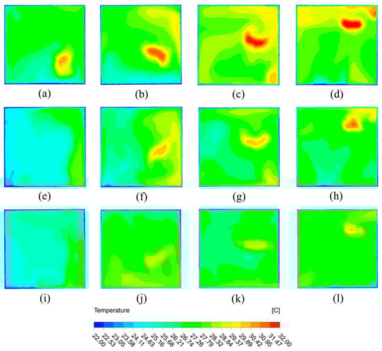 Temperature cloud of Z = 1.1 m section: (a) 3 m/s-30°; (b) 3 m/s-45°; (c) 3 m/s-60°; (d) 3 m/s-90°; (e) 4 m/s-30°; (f) 4 m/s-45°; (g) 4 m/s-60°; (h) 4 m/s-90°; (i) 5 m/s-30°; (j) 5 m/s-45°; (k) 5 m/s-60°; (l) 5 m/s-90°.