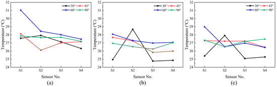 The temperatures of the four sensor locations located around the personnel simulated by the co-simulation under twelve airflow organizations are output as shown in Figure 14a–c. For the three different air supply velocities, temperatures of the four locations are more stable for the air supply angle of 90° with little difference and a lower overall temperature. This is because that the air supply path is further away from the four sensor measurement points at this angle. The temperature of the measuring point of the S1 sensor is higher than the other three measuring points when the air supply angle is 45° and 60°. This is because the hot air is closer to the S1 position for the two air supply angles. The highest temperature is at the location of S2 when the air supply angle is 30° since it is influenced by the air supply path. The concentration of high temperature areas around S2 caused the temperature at S2 to be higher than the other three locations. The four sensor temperatures are averaged to represent the average temperature in the occupied area at a cross-section of Z = 1.1 m. This temperature was inputted into EnergyPlus to calculate the thermal comfort in the occupied area and the air-conditioning energy consumption with different air distributions.