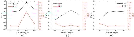 The average PMV-PPD values for personnel-occupied areas with different air distributions are shown in Figure 15a–c. Overall, PMV ranges from −0.3 to 0.3 with the maximum difference being less than 1. This indicates no significant differences of thermal comfort. For PPD, it reaches the maximum at a supply angle of 60° with a wind speed of 3 m/s. However, for larger wind speeds of 4 m/s and 5 m/s, PPD achieves the maximum at a supply angle of 30°. However, the PPD difference under other airflow organization conditions is not significant. From the perspective of thermal comfort, the case model is most suitable for a 45° air supply angle.