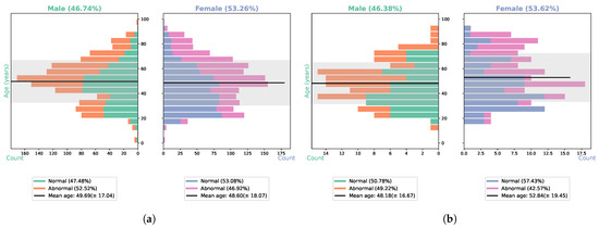 The TUH EEG Corpus [48] is the world’s largest and most accessible open-source EEG database. It has enabled numerous studies in the field of EEG analysis, including, but not limited to, seizure detection, seizure type classification, and general abnormality detection in EEG. One subset, TUAB (v2.0.0) [37], was released to enable research into the problem of automating EEG diagnostic evaluation. TUAB comprises 2993 EEG recordings obtained from over 2000 patients at TUH who were diagnosed with conditions such as epilepsy, strokes, depression, and AD [12,13]. The number of channels and sampling rates varied across EEG recordings, with each recorded from at least 21 channels, and most of the data were sampled at 250.0 Hz. Also, the duration for each EEG recording was roughly around 20 min [27,37]. The dataset includes both male and female patients across a wide range of ages (7 days–96 years). TUAB was released with two subsets: training and evaluation. The training set consists of 1488 abnormal and 1529 normal EEG sessions, while the testing set comprises 276 EEG recordings (150 normal/126 abnormal). The recordings underwent verification by human evaluators, resulting in a consensus of 99% for the training subset and a perfect agreement of 100% for the evaluation subset. Table 3 provides the details of the number of recordings and patients, whereas Figure 1 illustrates the age distributions in TUAB v2.0.0 training (a) and evaluation (b) sets, showing differences in normal and abnormal conditions and gender distribution. The training and evaluation sets do not share any record(s) from the same patient, making TUAB an invaluable resource for investigating the potential of techniques for patient-independent automatic detection of abnormality in EEGs.