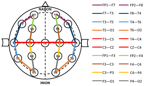 Depiction of EEG channels and their scalp locations following the International 10–20 system, as employed in this research, using TCP montage, adapted from [24].
