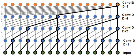 WaveNet was introduced by researchers from DeepMind at Google [35]. The originally proposed WaveNet had the ability to generate raw audio data with high temporal resolution. Experimental results revealed that it significantly outperforms more contemporary methods for Speech-to-Text (STT) and Text-to-Speech (TTS) tasks [57]. WaveNet architecture consists of multiple 1D CNN layers stacked on top of each other with a dilation rate doubled at each layer [53]. The dilation rate, the core element of WaveNet, is the distance between neurons in each layer. Figure 3 shows the process of dilated convolution found in WaveNet architecture. It can be observed that the first convolution layer receives a glimpse of only two time steps of the sequence. In the next layer, double dilation rate, four steps of the sequence are perceived. In the following layer, eight steps occur at a time, and so on. In this way, the network can learn long-term patterns as well as short-term patterns of the input at the higher-level layers and lower-level layers, respectively. Moreover, the design of WaveNet comprises residual blocks with gated activation units and skip connections, which help the network to avoid the vanishing gradient problem, promote convergence, and speed up training.