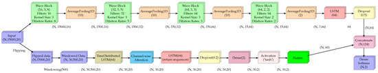 The proposed model consists of two paths, a WaveNet–LSTM and an attention-based LSTM (see Figure 5). It was built and trained using 50 epochs, with a batch size of 17, and the BalancedBatchGenerator from the imbalanced-learn library to ensure balanced class representation in each batch. Early stopping was used as a method of regularization technique to prevent overfitting. It monitors the validation loss and suspends training when there is no improvement over 10 consecutive epochs [28,58]. The effectiveness and reliability of performance rely on having a balance between a model’s learning capacity as well as its generalizability [53]. Therefore, early stopping is one of the most optimal methods for achieving this balance by preventing over- or under-fitting due to erroneous training epoch specifications [53]. The cross-entropy function served as the cost metric, and we utilized the Adam optimization algorithm. We set the initial learning rate at 0.001 and employed a callback function to adjust the learning rate during training based on the loss function with a minimum value of .