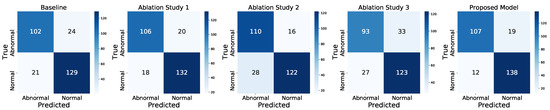 We report the final results of our proposed model on held-out datasets, as shown in Table 3. We computed three widely used metrics in the literature: sensitivity, which measures how well the model identifies abnormal cases; specificity, which reflects the model’s proficiency at detecting normal cases; and accuracy, which provides a measure of the overall performance of our model. These metrics are derived from the confusion matrix, which presents the true positive rate (TP), true negative rate (TN), false positive rate (FP), and false negative rate (FN). Hence, sensitivity, specificity, and accuracy are calculated as follows: