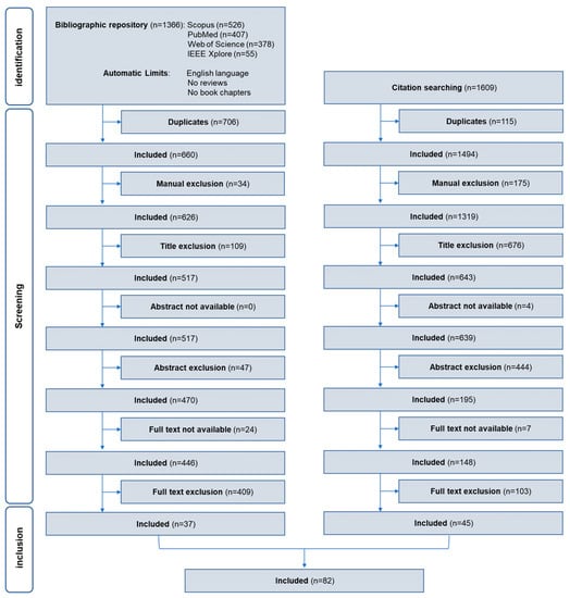 Overall, from the application of the search query and the citation search, 82 documents were included in the review. Figure 1 shows in detail the literature and citation searches, as well as the screening phases, that led to the selection of the documents included in the review.