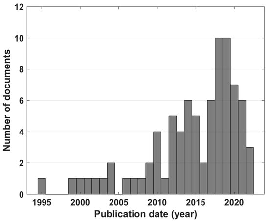 Most of the included documents were articles (specifically 65, 79%) [5,16,18,19,20,21,22,23,26,27,28,29,30,31,32,33,34,35,36,37,38,39,40,42,43,44,46,47,52,53,54,55,56,57,58,59,60,62,63,64,65,66,67,68,69,70,71,72,73,74,75,76,77,78,79,80,81,84,86,88,89,90,91,92,96], while the remainder (specifically 17, 21%) were conference papers [2,24,25,41,45,48,49,50,51,61,82,83,85,87,93,94,95]. Overall, the included documents covered the time period from 1995 to 2022. About 44% of included documents were published in the last five years, with 24% of documents published between 2018 and 2019. Figure 2 shows the distribution of document publication dates expressed in years.