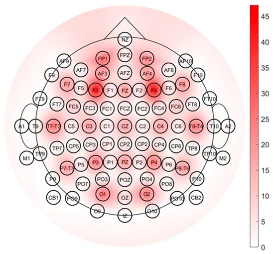 Figure 4 shows a topographical bidimensional scalp map specifically considering an extended 10–20 EEG electrode montage system, where each electrode is characterized in terms of the number of times it is considered in the literature to compute the involvement index. In particular, the range of colors from white to red corresponds to a higher use rate of electrodes. From the figure it is possible to conclude that the most used electrode positions for computation of involvement indexes are F3 and F4, followed by Fz and FP1, i.e., the frontal and prefrontal areas.