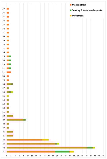 Distribution of documents included based on the application field: 5 documents related to movement ([20,21,23,58,60]), 10 documents related to sensory and emotional aspects ([19,26,40,42,43,51,54,61,84,94]), 67 documents related to mental strain (the remaining included documents).
