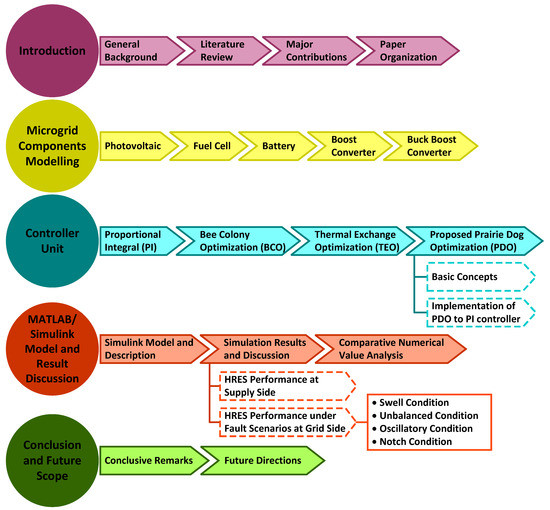 - Design, simulation, and optimal control of PV-, FC-, and battery-based HRESs for MG application with PQ enhancement in MATLAB/Simulink environment and application of suggested robust PDO algorithm to dynamically tune the PI gain parameters for ensuring improved PQ, system efficacy, and reliability.