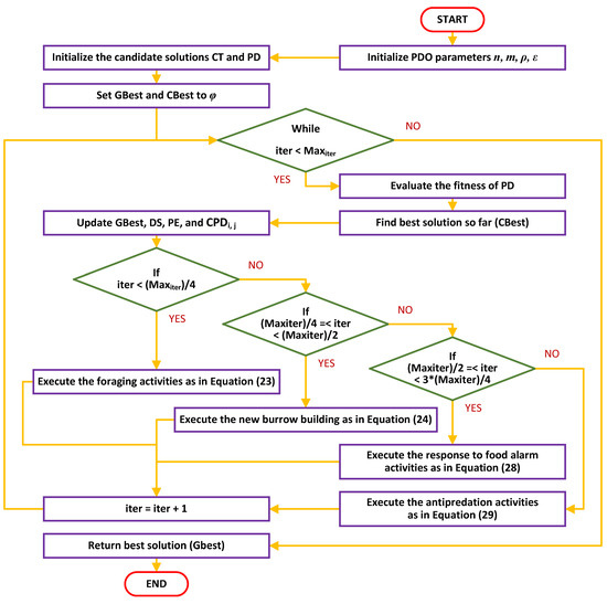 The PDO algorithm mimics the activities of four prairie dogs () to achieve optimization. The optimization problem domain is explored using the ’ feeding and burrow-building behaviours. The’ tunnels are built upon a bountiful food source. As the current food source runs out, they search the entire colony or problem space for other food sources or solutions [35]. They create new tunnels around each new food source they uncover. The distinctive responses of the have been employed for two different alarm or communication sounds. The sounds or signals used by can indicate anything from the presence of predators to the availability of food. The exceptional communication skills enable them to fulfil their nutritional requirements and defend themselves against predators. When the PDO is implemented, these two separate behaviours induce the to gather in a certain spot or a promising area, after which exploitation is carried out to discover better or nearly ideal solutions. The herbivorous burrowing rodents known as are found in the Great Plains, the southwest desert grasslands of the United States, the regions surrounding the plains and plateaus of Canada, and Mexico [50]. The is related to the Sciuridae family of squirrels, which also includes ground squirrels and chipmunks.