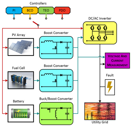 In recent decades, electric grid networks have been involved in a variety of challenges, such as the use of fossil fuels and thermal production, which generates energy with crucial emissions that are costly, polluting, and fuel-depleted [1]. Subsequently, researchers have proposed the deployment of renewable energy sources (RESs) in the last few years because of the merits such as being environment friendly and abundantly available, energy security, decreased line losses, low operating costs, and ability to mitigate emissions and global warming [2]. Furthermore, due to the rising population and increased industry, the power demand has recently risen significantly. Hybrid renewable energy sources (HRESs) are being incorporated into the grid to meet the rising electricity demand, improve dependability, lower losses, and reduce the use of fossil fuels, which contribute to pollution [3]. Numerous HRESs such as photovoltaic (PV) [4], fuel cell [5], wind energy [6], and biomass [7] are integrated along with local loads and storage units to form a small entity of an electrical grid network termed a microgrid (MG) system [8]. In this article, the PV-based RES has been used for its numerous advantages such as [4] (1) no fuel cost, (2) extensive power expansion, (3) ease of operation even on a building’s rooftop, (4) low maintenance costs, (5) being plentily available, (6) being eco-friendly, (7) high reliability, and (8) being noiseless. To form an HRES, FC has been integrated with PV due to the following merits [5] (1) ease of use, (2) increased efficiency, (3) less hazardous pollutants, (4) increased modularity, (5) massive CHP, (6) increased stability, and (7) cost-effectiveness. But the major demerits associated with PV/FC systems are that PV supply is dependent on temperature and irradiance, FC response is sluggish, and at higher temperatures, the cost of the material rises, making it uneconomical to use. Therefore, this research article proposes the hybridization of battery-based energy storage units (due to high energy storage capability) [9] with PV/FC to competently meet the power demand as well as improve the performance, fuel economy, stability, and reliability of the MG system.