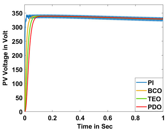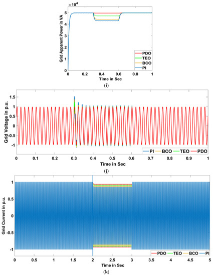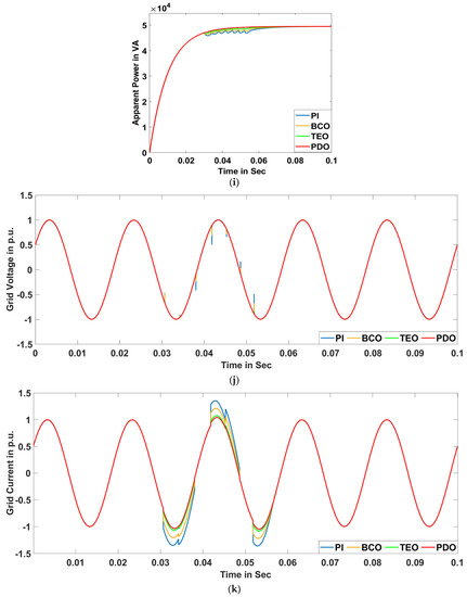 - Comprehensive contrast study of different system characteristics at the grid side subjected to numerous PQ faults (swell, unbalanced load, oscillatory transient, and notch) such as active power, reactive power, apparent power, voltage deviation, power factor, frequency, THD, DC-link voltage, grid voltage, and grid current for the conventional and proposed techniques along with critical analysis of obtained numerical values for the suggested PDO technique and the conventional TEO, BCO, and PI methods by tabulating all control gain parameters (Kp and Ki) and system parameters (terminal voltage (Volt), DC-link voltage (volt), voltage deviation (p.u.), active power (watt), reactive power (Var), apparent power (VA), THD (%), power factor, frequency (Hz), grid voltage (p.u.), and grid current).