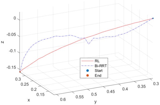 Comparison of trajectory planning between Bi–RRT and RL methods.