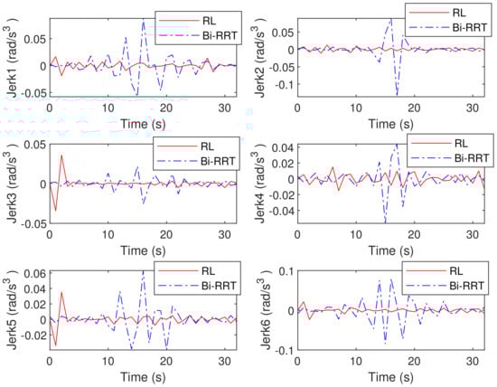 Figure 4 and Figure 5, respectively, show the velocity and acceleration of six joint movements during the trajectory-planning process of the robotic arm. Figure 6 also displays the jerk variation for six joints of the Bi-RRT and RL in the trajectory planning of a six-axis robotic arm. The proposed RL method exhibited a marginally smaller oscillation amplitude compared to the Bi-RRT method, further substantiating that the RL method can optimize the planned trajectory, while the Bi-RRT method cannot accomplish such applications.