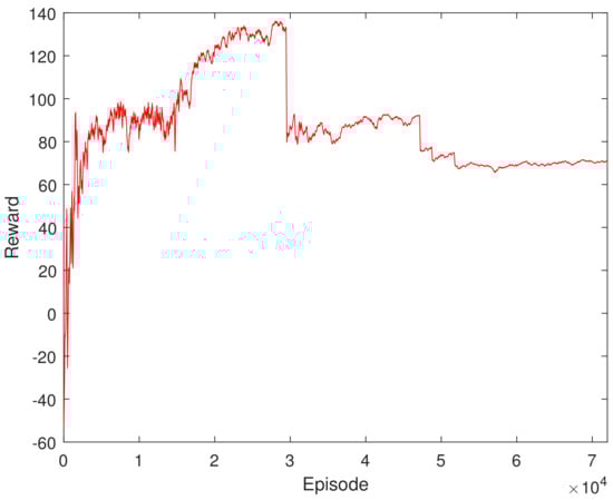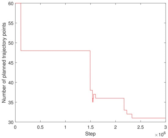 Figure 7 depicts the average reward during the training process. It can be seen that the training reward has several stable stages, which is due to the adaptive adjustment of the step time. When the step time changes, the corresponding cumulative reward will undergo new changes and eventually tend to be stable. Figure 8 shows the change in the time step size of the decaying episode throughout the training process. It can be seen from Figure 8 that, as the training continued, the time step of the episode decreased gradually, from 60 to 46, then to 36, and finally, to 32 under the set maximum training conditions, and finally, it tended to be stable. This result can be verified indirectly from Figure 7. This demonstrates the adaptive adjustment of trajectory planning, which corresponds to the continuous updates occurring within the neural network.