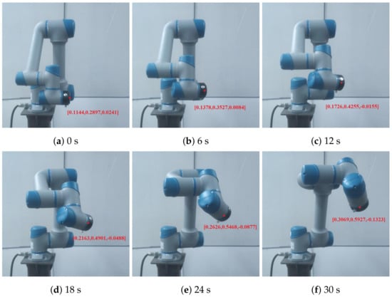 To validate the effectiveness of the proposed RL-based trajectory-planning method in a real-world scenario, a physical experiments was conducted by using a cooperative robotic arm. The experiments were designed to closely follow the simulated scenarios, and the robotic arm’s motion was captured at different time intervals (0 s, 6 s, 12 s, 18 s, 24 s, and 30 s). The performance of the robotic joints’ changes demonstrated the practical applicability of our proposed method.