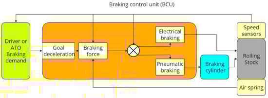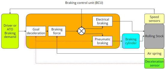 The characteristics of electric braking force result in its minimal contribution at low speeds, with the entirety of braking force being primarily provided by the pneumatic braking force during such instances. During emergency braking scenarios, the pneumatic braking force becomes solely responsible for deceleration. Brake commands typically encompass seven levels, each corresponding to distinct deceleration targets. However, existing brake control systems are structured as open-loop systems, with the brake command serving as the input and train deceleration as the output. Nonetheless, these current brake control systems, as seen in Figure 2, lack the capability to verify whether the train’s deceleration aligns with the desired target.