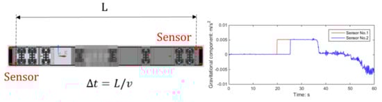 In railway design standards, the slope of a rampway typically ranges from 20‰ to 30‰. When the ramp is sufficiently long, the train’s attitude can be determined by observing the effect of gravity on the acceleration of the front and rear cars, as shown in Figure 4. In general, these two acceleration signals should have equal magnitudes but opposite directions. However, due to the successive influence of gravity on the acceleration signals within specific time intervals, the train experiences a change in attitude. By considering the train’s speed, these time intervals can be determined. The polarity of the gravity effect can indicate whether the train is moving uphill or downhill.