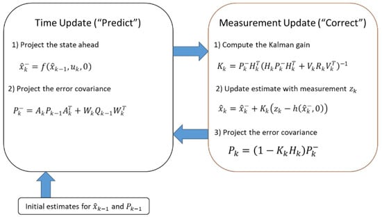 Now, Equation (18) can be used for the measurement update in the extended Kalman filter, with and that are taken from Equations (4) and (5). The Kalman gains as the basic Kalman filter with the appropriate substitution for the measurement error covariance.