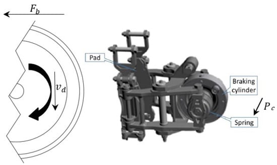 The braking force exerted by the braking device corresponds to the frictional force generated upon contact between the brake pad and the brake disc. Usually, the air pressure provided by the brake cylinder acts upon the piston of the brake cylinder, resulting in the piston rod to generate thrust, which is amplified by the lever system of the basic brake device and finally converted into brake pad pressure and applied to the brake disc. Equation (24) is the braking force in regard to the braking time.
