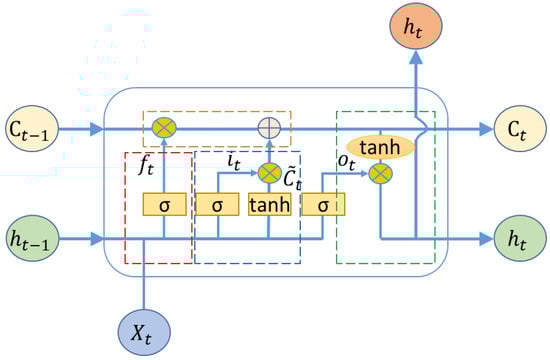 Figure 7 illustrates the four components of the LSTM model, namely the forget gate, input gate, output gate, and cell state. Several parameters are mentioned, namely , the input; , the cell stat for long-term memory; and , the hidden layer for short-term memory.