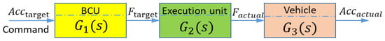 As shown in Figure 8, the generalized brake control system discussed earlier can be segmented into three components: the brake control unit, the brake execution unit, and the controlled entity. In these, is the transfer function of the braking control unit. After a braking command is issued, the transfer function assesses the required deceleration based on the braking intensity. It then calculates the target braking force and proceeds to distribute the braking force accordingly. is the transfer function of the braking execution link. The braking force is imposed on the vehicle through the braking apparatus. Nonetheless, due to the impact of uncertain parameters, like the device’s internal friction coefficient, the actual braking force may diverge from the target braking force. is the transfer function of the controlled object, which is mainly affected by the adhesion between the wheel and the rail. Ultimately, the control system yields the actual deceleration.