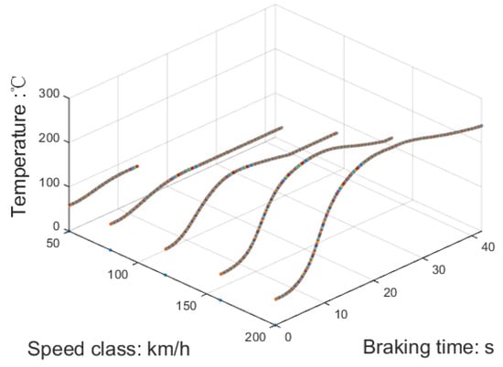 To obtain the disc temperature increase in Equation (25), a dedicated test bench is used to monitor the temperature change process under different speed classes. Through the analysis of the temperature curve of the brake pad, it becomes possible to determine the corresponding friction coefficient for each speed category.