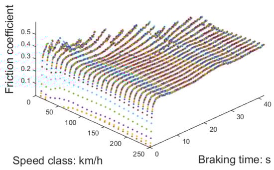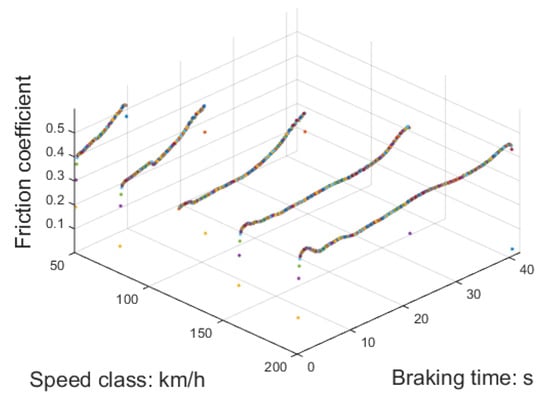 Using the temperature of the braking disc as a reference, the friction coefficient at different speed classes can be determined and are illustrated in Figure 14. It is evident that there is a substantial rise in the friction coefficient when the initial braking speed is 50 km/h. However, as the initial speed of braking increases, the alteration in the friction coefficient becomes less prominent. To ensure a more consistent braking force, the pressure applied to the brake cylinder should be adjusted to counteract this changing trend.