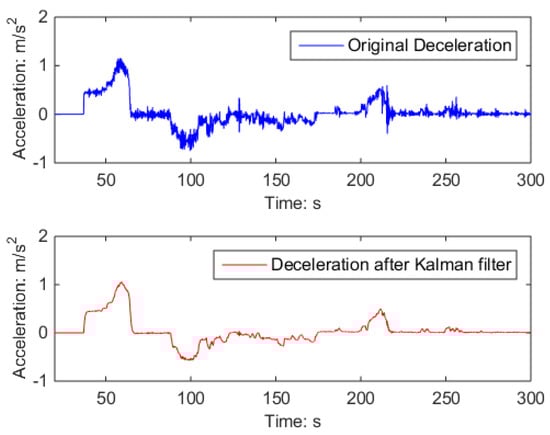 The controller equipped with the deceleration sensor is installed on the train, but the operational vibrations introduced noise into the deceleration signal. To address this, a Kalman filter was employed for filtering. The discrete variable form of the filter offers a simple structure, requires minimal calculations, and facilitates real-time operation in the train controller. It is crucial to address the issue of the deceleration sensor’s sensitivity, as it is able to detect speed fluctuations even during non-braking situations.