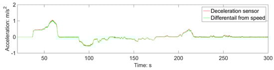Since the test route does not include any curves, it was not possible to assess the road conditions related to curves using acceleration information. However, Figure 17 provides valuable insights, indicating a slight disparity of 0.005 m/s2 between the deceleration sensor signal and the signal derived from the speed differential solution. This suggests a nominal rampway angle of approximately 5‰.