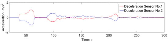 The signals collected by the deceleration sensor indicate that the application of Kalman filtering and digital signal processing techniques successfully mitigated noise and the acceleration–deceleration oscillations resulting from uneven speed during vehicle operation, as depicted in Figure 16. Nevertheless, the variations in deceleration throughout the braking process were still detected and maintained.