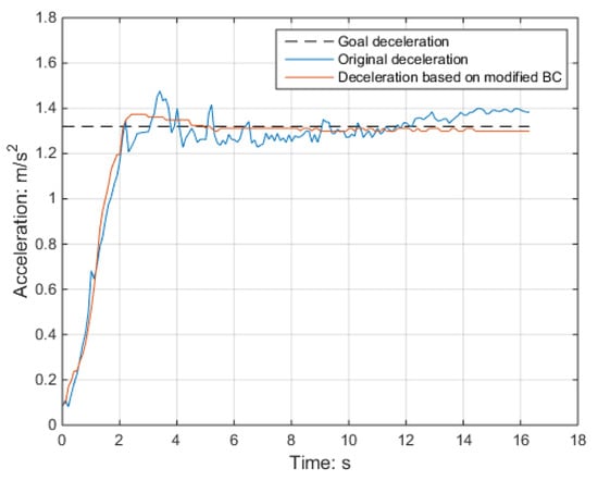 The brake cylinder pressure and deceleration during the braking process were analyzed for the selected speed classes, with a focus on a lower speed of 60 km/h for safety purposes. Figure 19 and Figure 20 display the brake cylinder pressure and deceleration data, respectively, for both the original and modified methods. The brake cylinder pressure was obtained using a pressure sensor in the BCU, while the deceleration was measured using a deceleration sensor. It is evident from the results that the modified method leads to smoother and more closely aligned deceleration with the target deceleration of 1.32 m/s2. This demonstrates the effectiveness of adjusting the brake cylinder pressure using the dynamic friction curve.