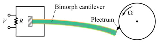 When the rotating plectrum plucks the tip of the bimorph cantilever, the cantilever structure is deflected, and the resulting mechanical strain in the piezoelectric materials is converted into the electrical current that flows through the external load resistance. Through this energy conversion mechanism, the piezoelectric cantilever energy harvester can extract useful electrical energy from rotational motions, such as individuals passing through turnstile gates, rotating vehicle wheels, and wind turbines, to power autonomous micro-sensors or devices.