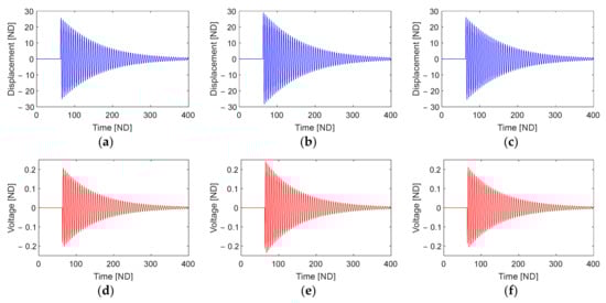 The transient response of the piezoelectric energy harvester is obtained by numerically integrating Equation (22) using the Runge–Kutta method with the ode45 function in MATLAB. The baseline values of the dimensionless parameters are given as , , , , , , , and , which are utilized for all simulations unless stated otherwise.